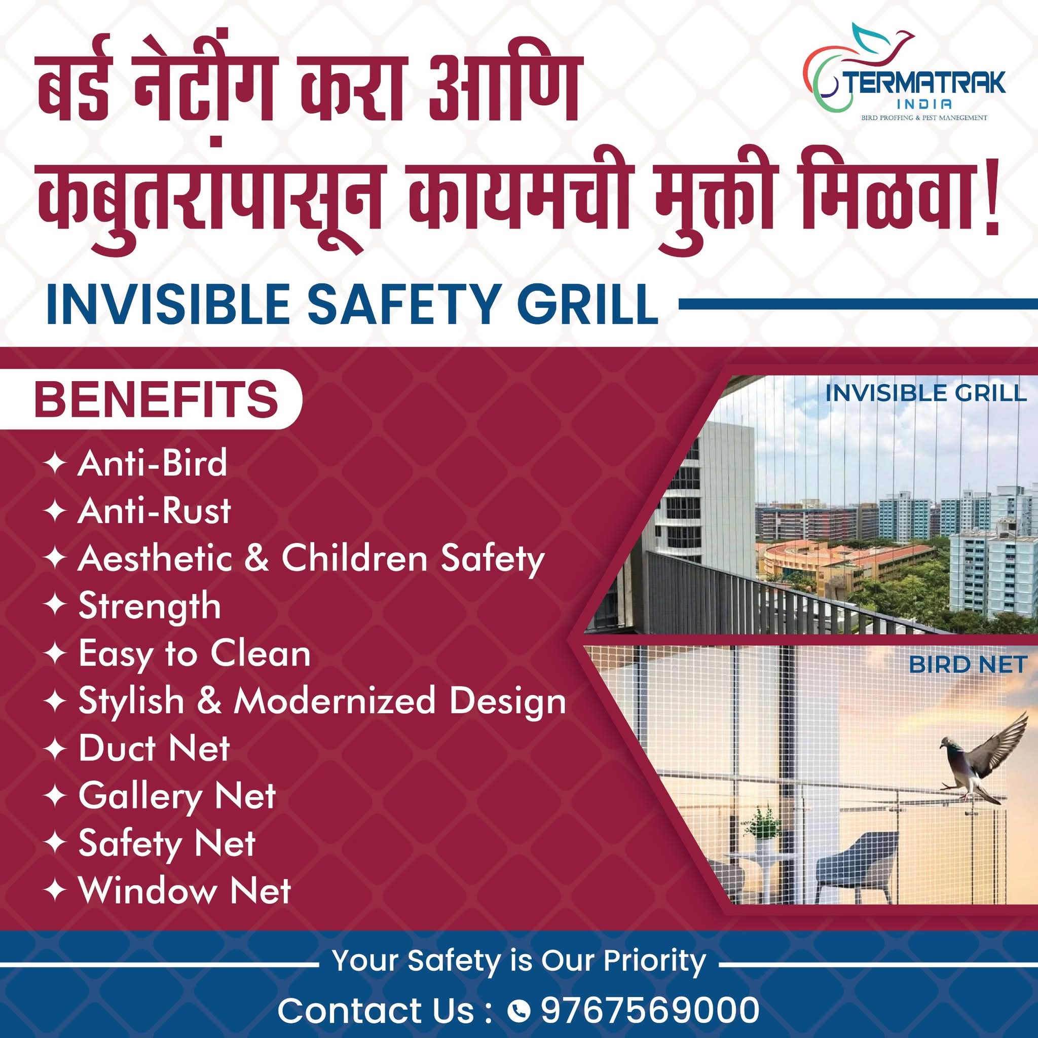 In case of Pigeon netting we use net size of mesh 2” (40/50 mm). Our netting is very fine & is hardly visible. And it is installed with robust mounting system giving your home a neat and beautiful appearance. Our netting doesn’t harm birds it just acts as a barrier for them from entering.